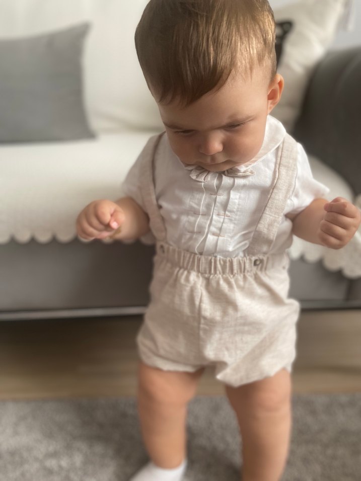 Keten kumaştan yapılmış, vintage tarzda, yakalı, kısa kollu, düğmeli beyaz ve gri tonlarda erkek bebek takımı. Bir kere doğum gününde giyildi sadece