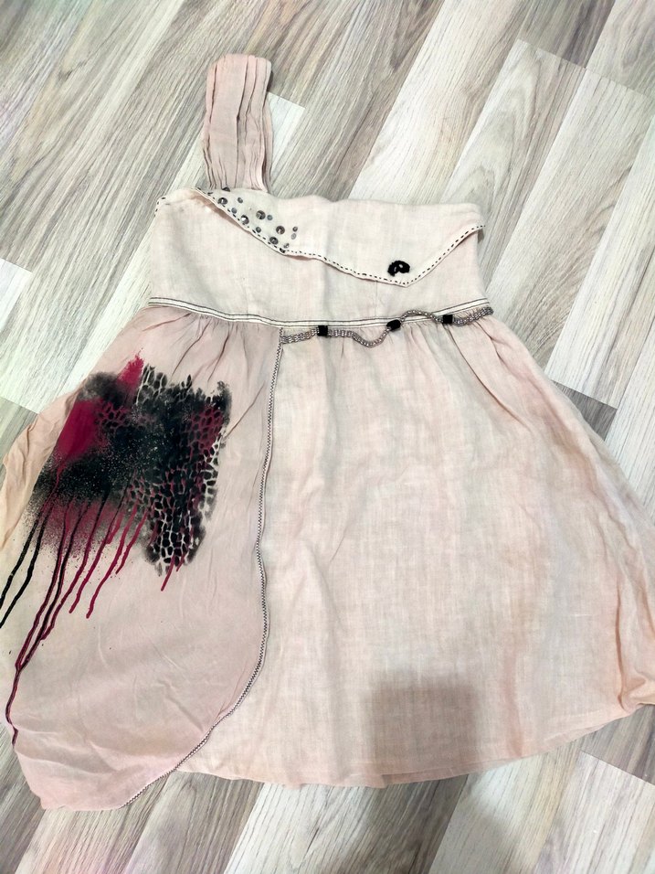 Keten kumaştan, kolsuz ve straplez elbise Bol kesim, drapeli ve nakışlı detaylarla pastel pembe renkte bohem tarzda.