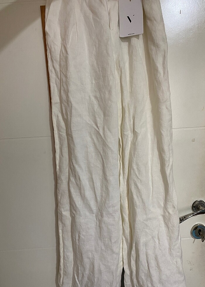 Vatkalı marka etiketi üstünde keten Palazzo.
