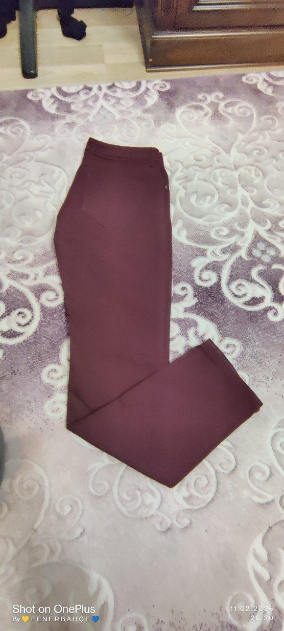 Bordo renkli, regular fit kesime sahip kadın kumaş pantolon. Midi boyda, sentetik kumaştan üretilmiş ve fermuarlı detaylar içerir. Rahat ve şık, günlük kullanıma uygun.