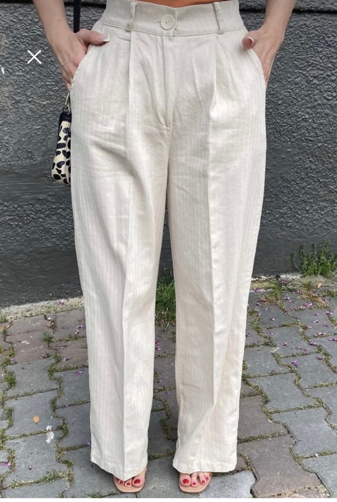 Krem keten kumaştan, ve pileli,, rahat kesim pantolon. Ham ketendir iç göstermez