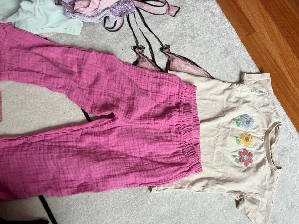 Pembe keten kumaştan, belinde fırfırlı, rahat kesim midi boy pantolon. Günlük kullanım için konforlu ve pastel tonlarda bir seçenek.