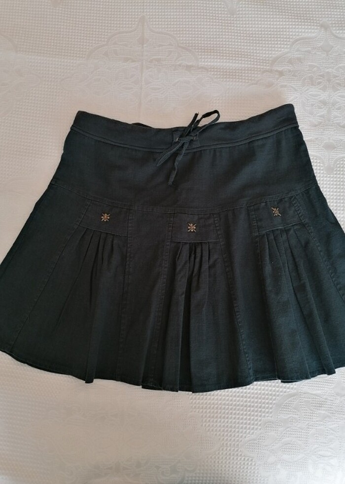 Keten pileli yazlık terletmeyen etek. Bel ölçüsü 50 cm. Esnetince 55 cm. Oluyor. Boy ölçüsü de 50 cm.'dir.