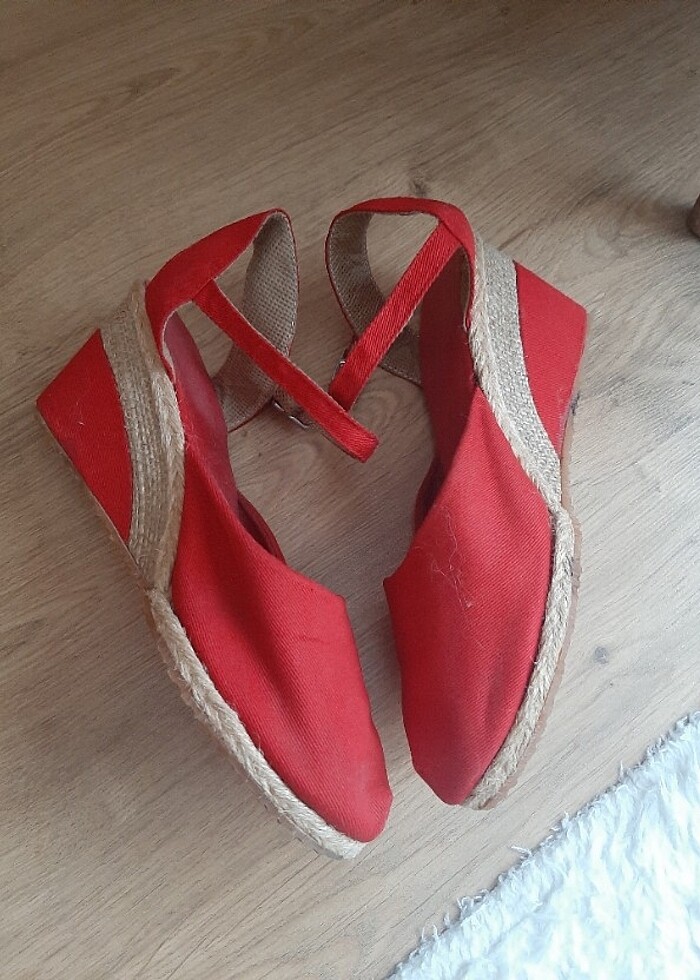 Rahat temiz şık bir ayakkabi kırmızı tonu resimde açık çıkıyor daha tok bir rengi var güzel kırmızı hiç giyilmedi kumaşı keten