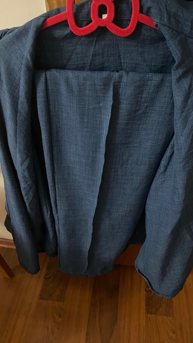 Navy renkli keten, bol kesim, uzun kollu, drapeli ve çentikli yaka detaylı. Minimalist ve desensiz tasarım, günlük kullanım için uygun. L/XL beden hiç giyilmedi