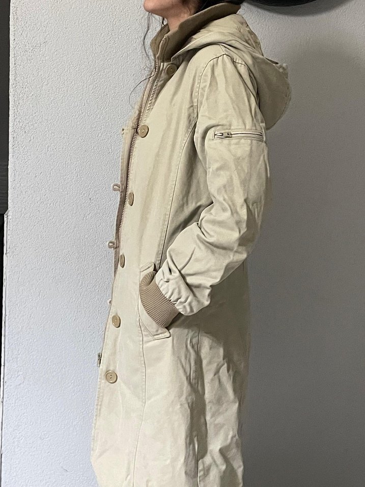 Bej renkli, keten kumaştan yapılmış, düğmeli ve kapüşonlu midi trençkot. Rahat kesimi ve uzun kollarıyla sokak stiline uygundur. Twenty marka bej uzun mevsimlik mont, kapüşonlu, düğmeli, fermuarlı model yarı fıyatına koyulmuştur