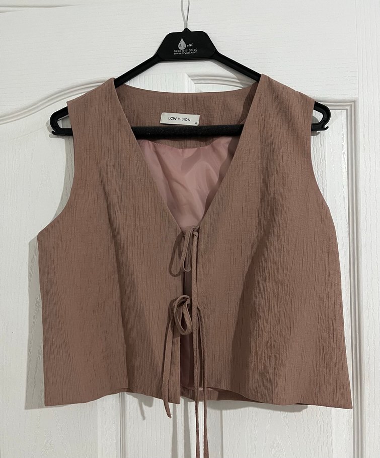 Lila renkli keten kumaştan, ipli ve V yakalı, salaş kesim midi boy kadın yelek. Günlük rahat kullanıma uygundur.