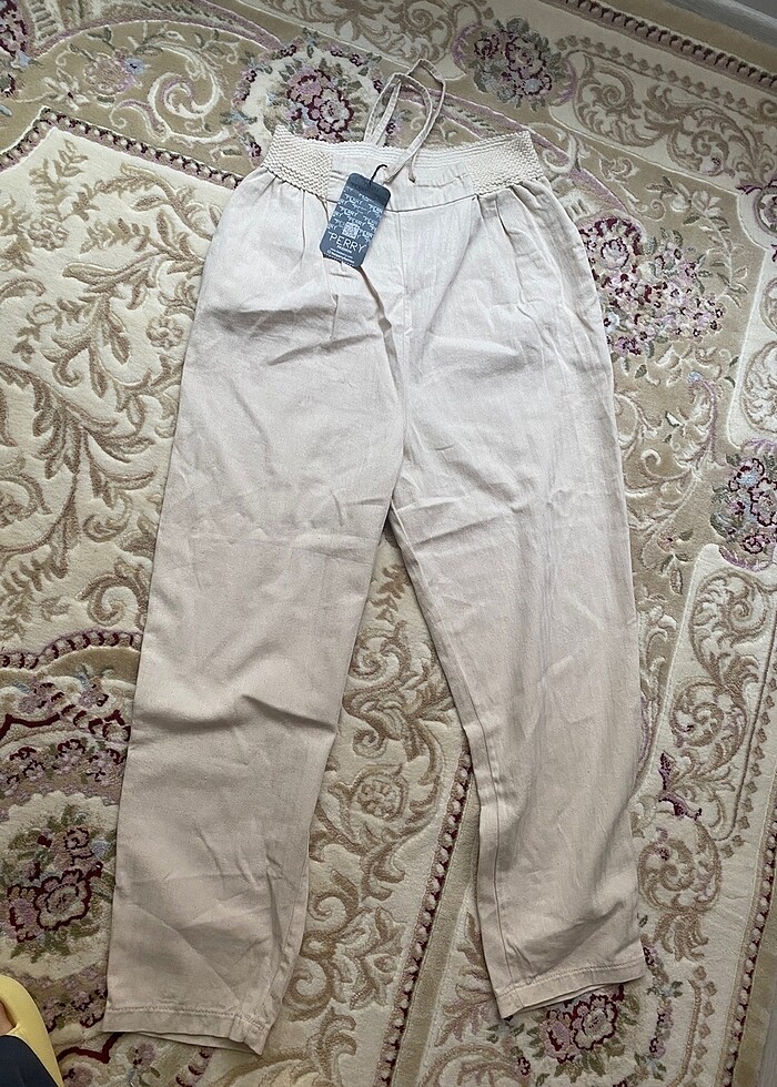 Hiç kullanılmadı etiketi üstünde ketensi beli lastikli kumaş pantolon Standart beden olarak geçiyor ama 38 40 bedene kadar giyilebilir havuç kesimdir