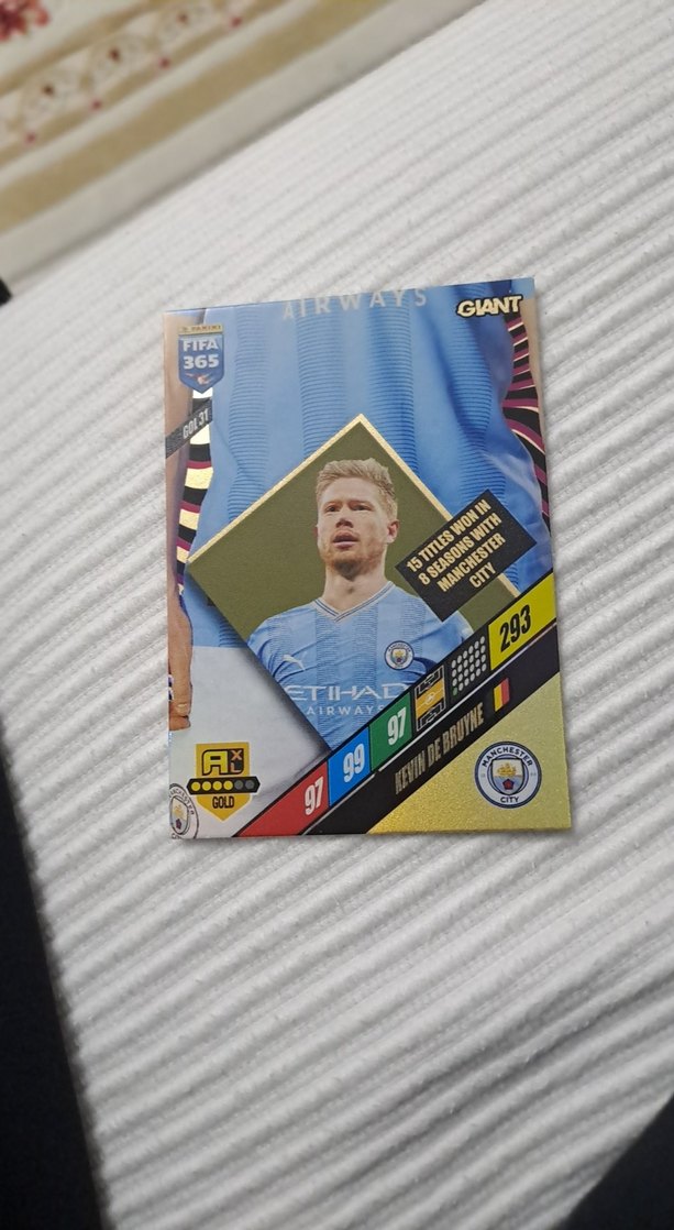 Kevin De Bruyne'nin Manchester City formasıyla altın detaylı kartı. Başarıları ve istatistikleri ile öne çıkan koleksiyonluk futbol kartı ⚽️.
