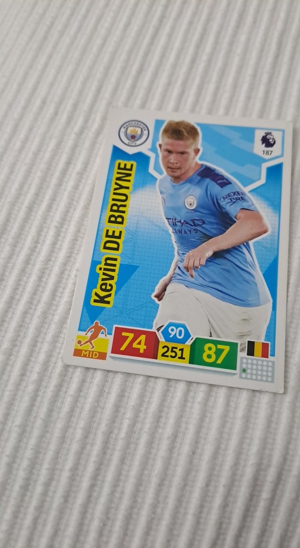 Kevin De Bruyne'un Manchester City formasıyla mavi futbol rozeti, 74, 251 ve 87 istatistiklerini gösterir. Orta saha pozisyonu ve Premier Lig bağlantısı yer alır. ⚽