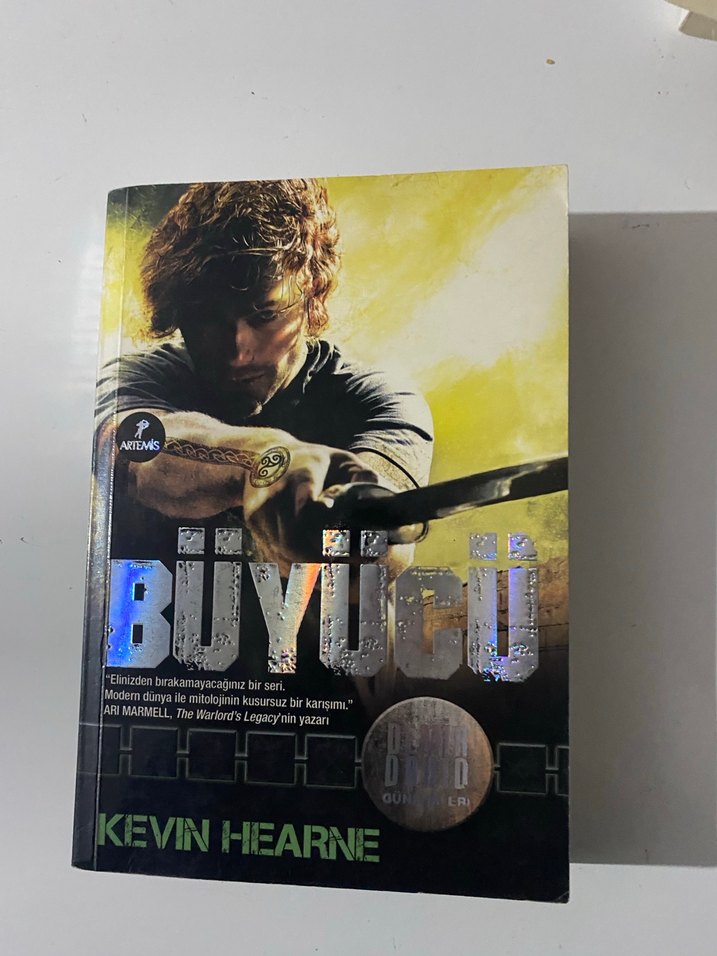 Kevin Hearne'in DİRİVÜCÜ adlı romanı, kılıç tutan savaşçı figürlü ve parlak arka planlı kapak tasarımıyla dikkat çekiyor. Modern ve mitolojik temaları birleştirir.