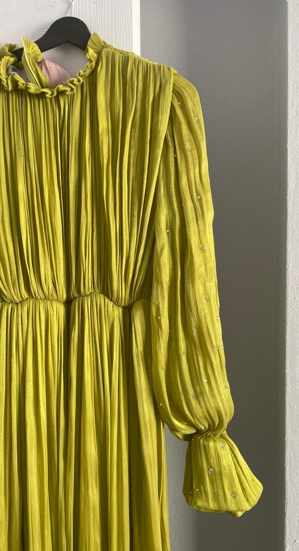 Sarı uzun keten elbise, pilili ve nakışlı detaylara sahiptir. Yüksek yakalı, askılı kollu ve bol kesimdir, bohem parti stiline uygundur.