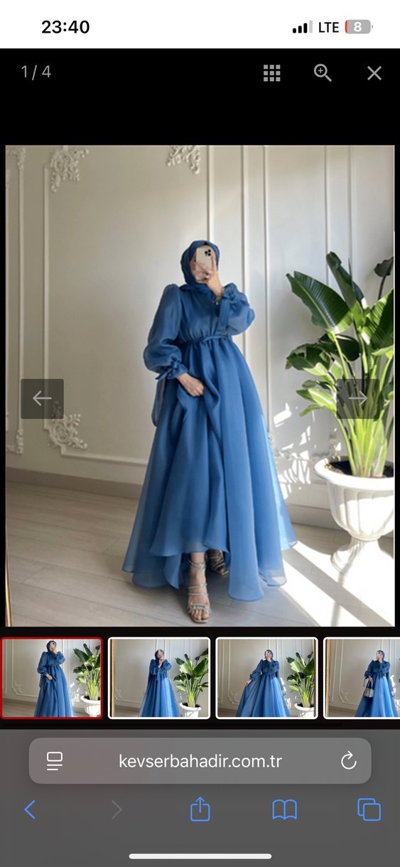 Uzun, bol kesim mavi elbise, drapeli katmanlar, yüksek yaka ve uzun kollu detaylarla günlük kullanıma uygun mütevazı ve gösterişli bir modeldir. En yakın arkadaşımın düğününde bir kere giydim 42 44 46 bedene uyumlu.