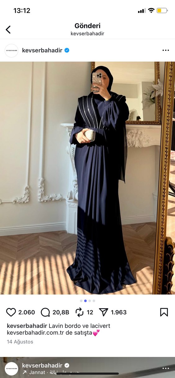 Uzun lacivert elbise, drapeli ve geniş kesimdir. Yüksek yakalı, askılı kollu ve desensiz, günlük kullanıma uygun gotik tarzda modest bir modeldir.