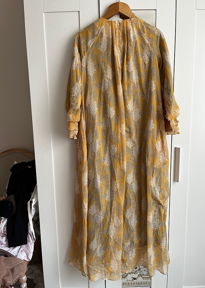 Kevser sarıoğlu marka özel gün elbisesi. Boy 133 kol 57 cm. Kol detayları ve dökümlü inen bir kumaşı var. Fotoğraftakinden daha tatlı bir sarı. Kardeşimin nişanında giyilmek icin alındı ütü yapılırken arka etek kısmında cok küçük bir kısım yandı fakat tamiri yapıldı üçüncü fotoğrafta mevcut. Dibine girip bakılmadığı sürece belli bile olmuyor. Yalnızca nişanda bir kez giyildi. Özel tasarım bir elbise. İster özel günde ister günlük olarak kullanılabilir #kevsersarioglu #elbise #tesettür