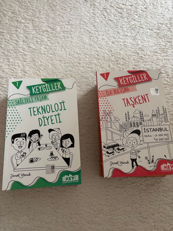 Keygiller serisinden 'Sağlıklı Yaşam Teknoloji Diyeti' ve 'İlk Buluşma Taşkent' adlı iki çocuk kitabı seti. Eğlenceli çizimler ve hikayeler içerir.