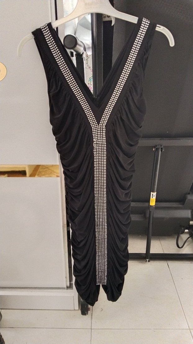 Bu siyah, drapeli, derin V yaka ve kolsuz uzun abiye elbise, önü desenli ve vücuda oturan kesime sahiptir. Avant-garde tarz partiler için uygundur.