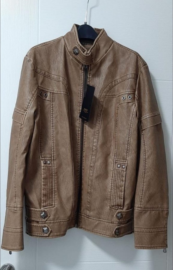 Kahverengi deri erkek biker ceket, kemerli bel, kesik yaka ve uzun kollu. Normal kesim ve midi boyda, günlük kullanım için uygun.