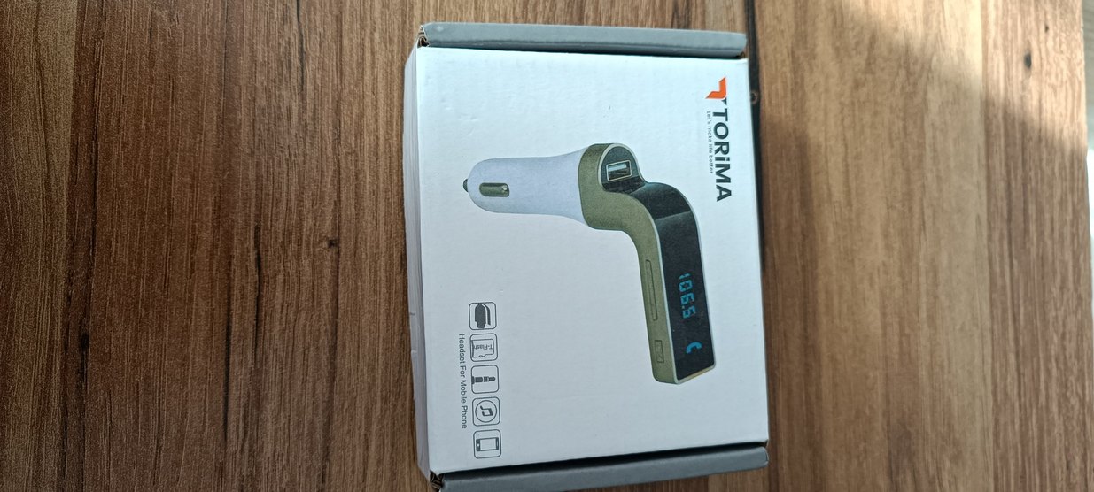 106.5 frekans gösteren FM vericili, eller serbest arama ve müzik çalma özellikli kahverengi gri Bluetooth araç kiti.