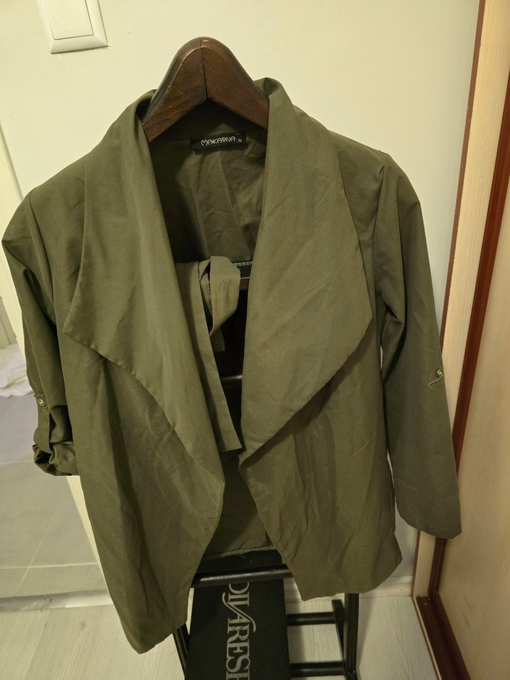 Khaki renkte, keten kumaştan, uzun kollu, normal boy midi ceket. Notch yaka ve dökümlü tasarıma sahip, rahat kesim. DIVARES etiketlidir.