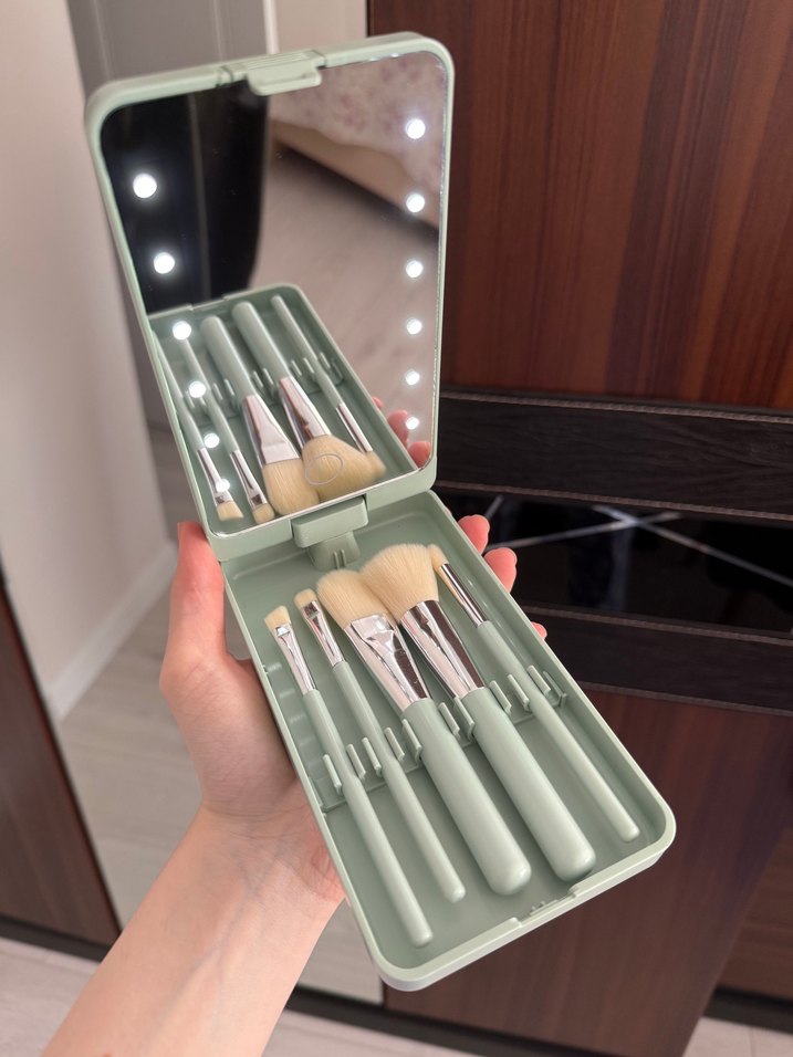 Yumuşak kıllı, çeşitli fırçalar içeren khaki renk makyaj fırçası seti, kompakt kutusunda aynalıdır. Pratik kullanım sağlar.