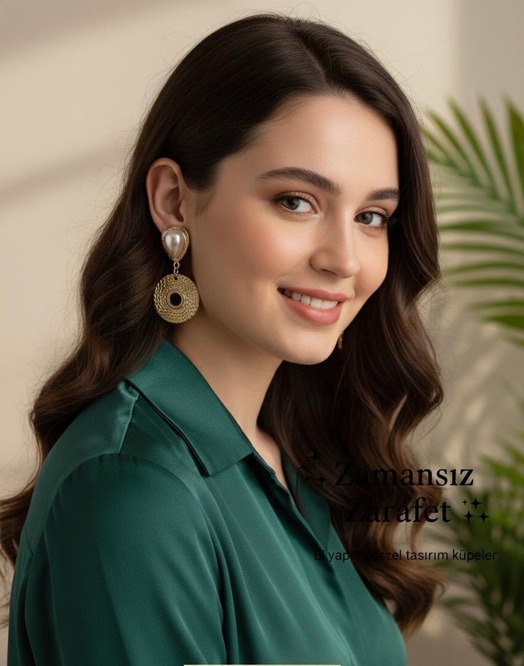 Kısa uzunlukta, etnik desenli ve düğmeli detaylı, parlak kaplamalı khaki renk mini küpe. Ofis için bohem tarzda uygun. ✨