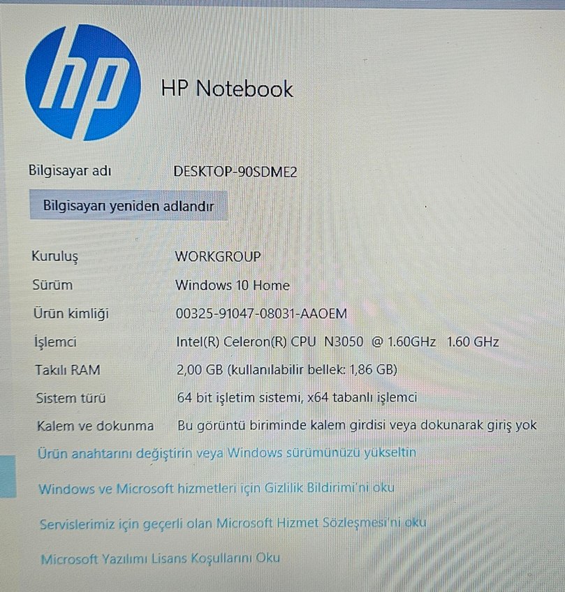 Khaki renk HP Notebook, Intel Celeron N3050 1.60 GHz işlemci, 2GB RAM ve Windows 10 Home 64 bit işletim sistemi ile. Ekranda kalem veya dokunmatik destekli. Pil çok iyi durumda değil, prizdeyken tam randıman çalışıyor.