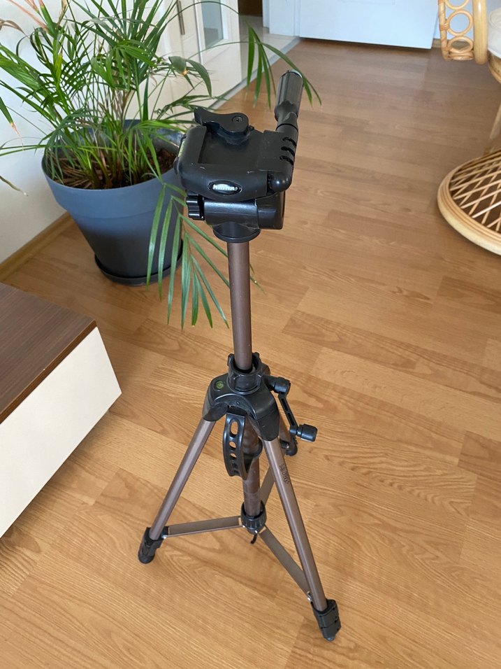 Ayarlanabilir ayaklara ve kamera montajına sahip khaki renkli tripod, sabit çekimler için uygundur. Koyu tonlarda ve hafif yapıda.