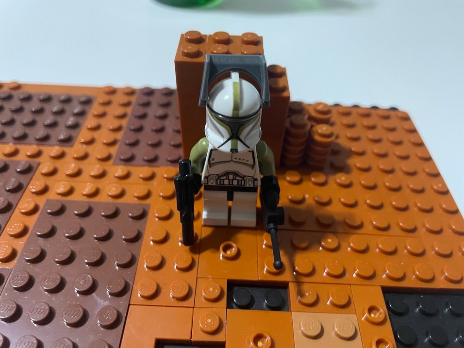 Khaki renkli Lego asker figürü, iki silah tutuyor ve kahverengi Lego tabanında duruyor. Miğfer ve detaylı zırh giymiştir.