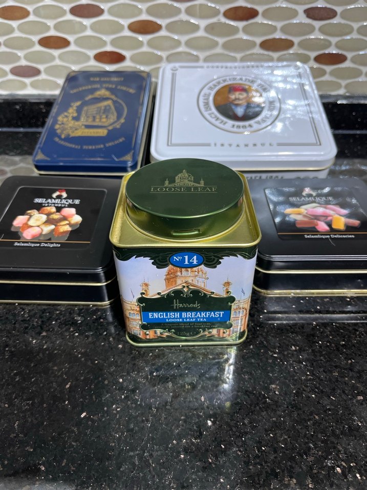Koyu haki renkli metal kutuda Harrods İngiliz Kahvaltı çayı, klasik tasarım ve tazeliği koruyan kapak ile sunulur. Tek çay kutusunun fiyatı diğerlerinin fiyatı farklıdır