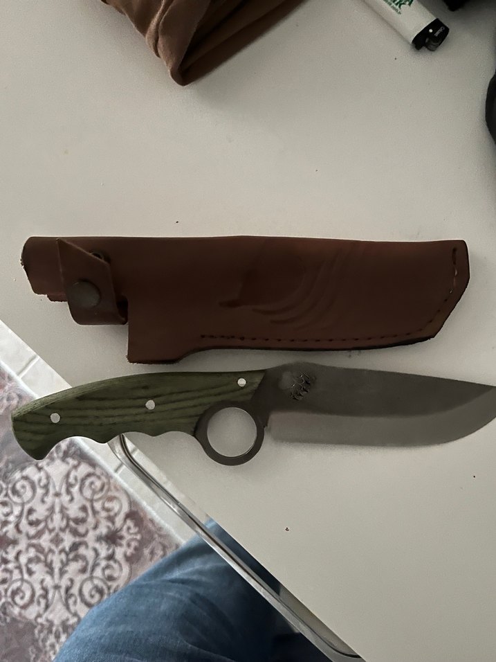 Koyu haki saplı, halka tutma yerli bıçak ve kahverengi deri kılıfı ile birlikte.