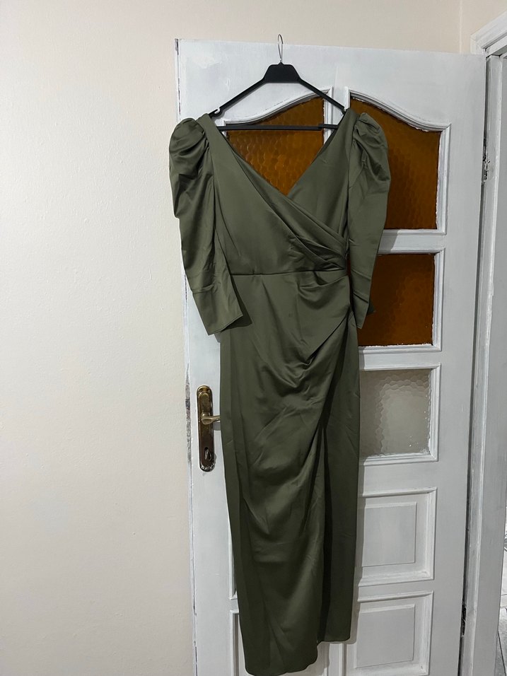 V yaka ve drapeli tasarıma sahip, ince kesim khaki uzun abiye elbise. Düğünler için uygun, klasik ve Paris sokak modasını yansıtan şık bir model.