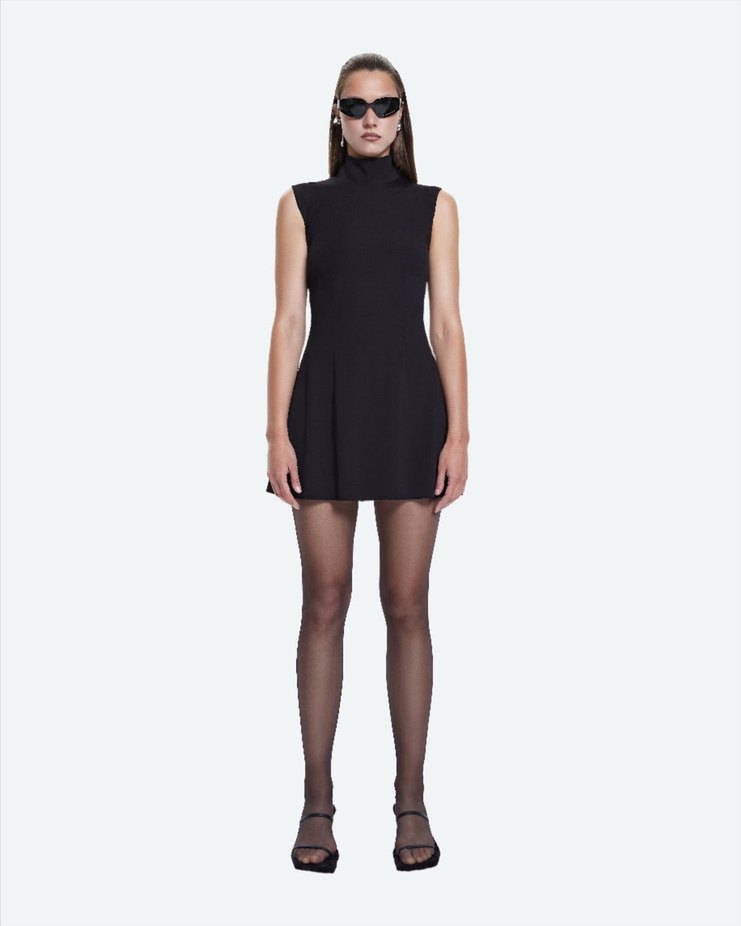 Yüksek yakalı, kolsuz ve vücuda oturan siyah midi elbise. Sentetik kumaştan, desen içermeyen sade tasarım, ofis için uygun, karanlık ve şık görünüme sahip.