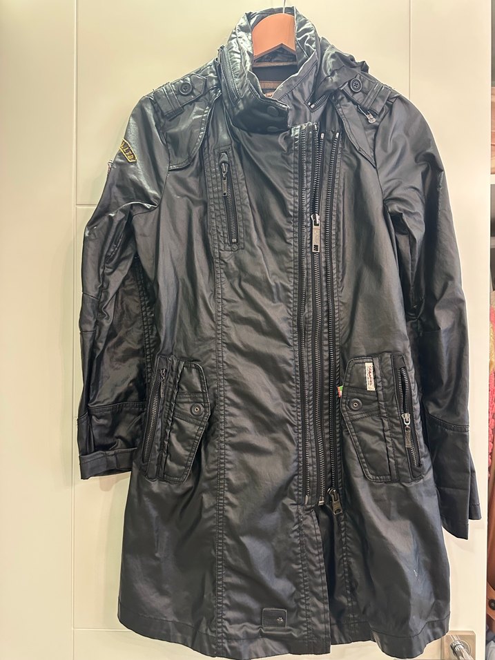 Kemerli, dar kesim siyah deri biker ceket, uzun kollu ve yakalıdır. Çoklu fermuarlı cepleriyle sokak stiline uygundur.
