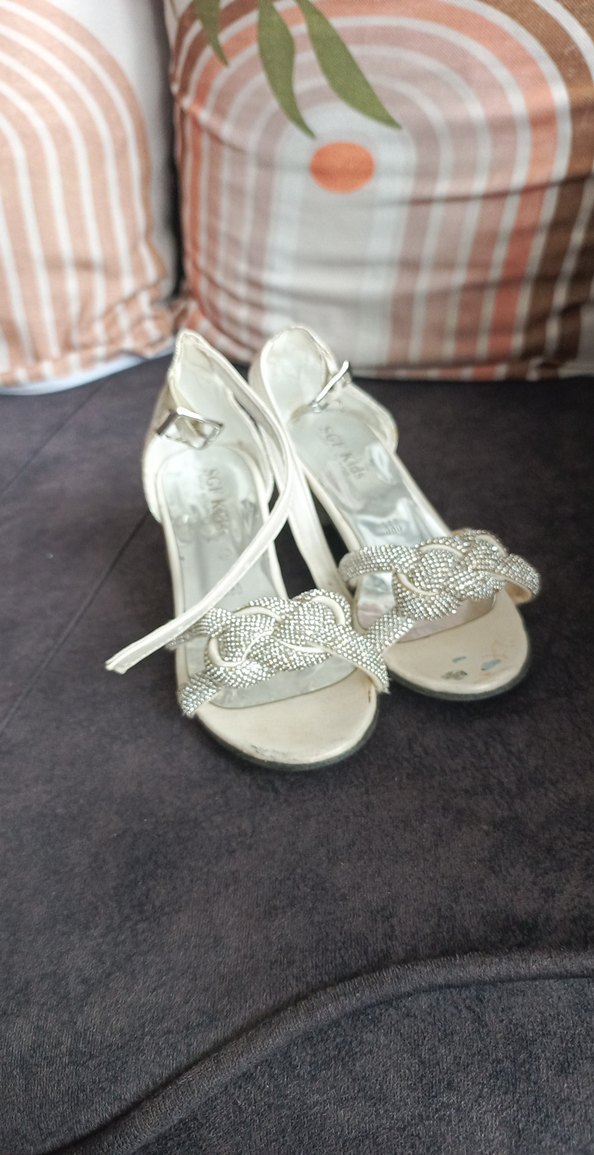 Tokalı bantlı ve ön kısmı süslü beyaz dolgu topuklu düğün ve şık etkinlikler için uygun. 27 numara