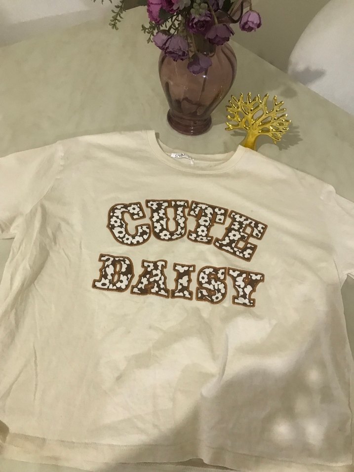 Pamuklu, kahverengi tonlarda, kısa kollu ve bol kesim tişörtü. Önünde 'Cute Daisy' yazılı baskı ile bohem ve retro stil sunar.