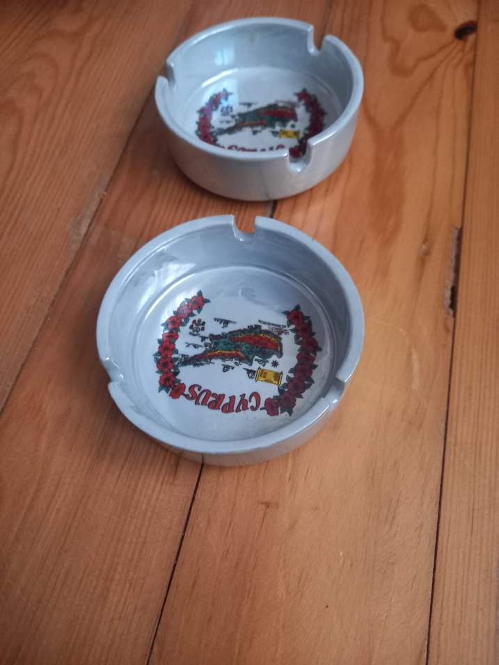 Canlı baskılı desenlere sahip Kıbrıs porselen yapılmış, iki parçalı küllük seti. Dekoratif ve kullanışlıdır.kucuk boy kibristan alinmistir ikili fiyar hic kulkanilmadi️