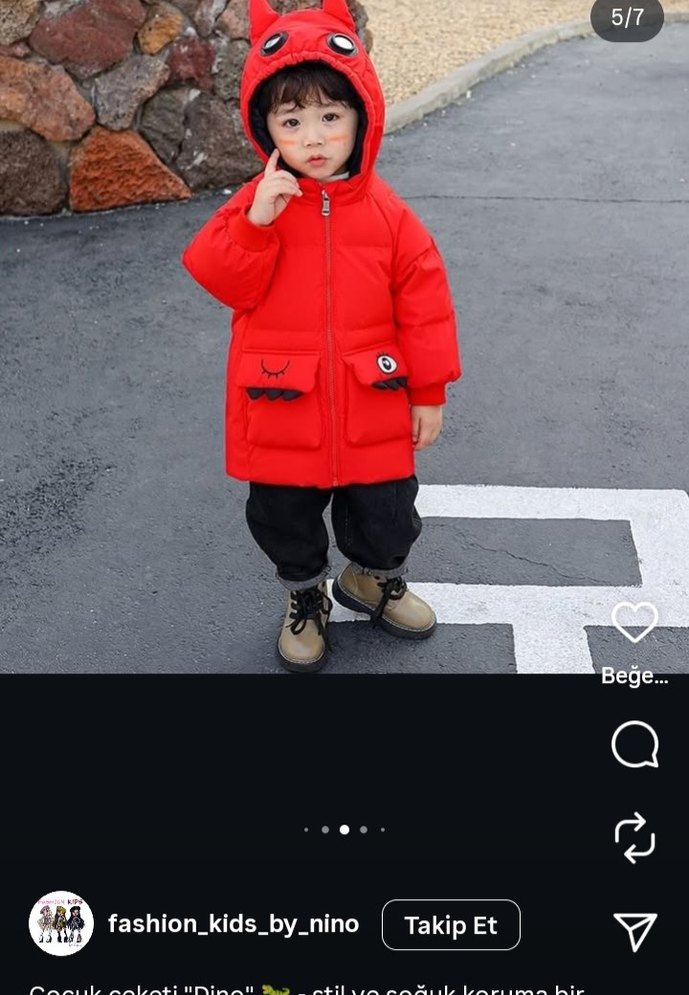 Kapüşonlu, kürklü detaylı, canlı kırmızı renkli, cep detaylı, yumuşak ve sıcak kumaştan dinozor detaylı mont 2 3 yasa uygundur