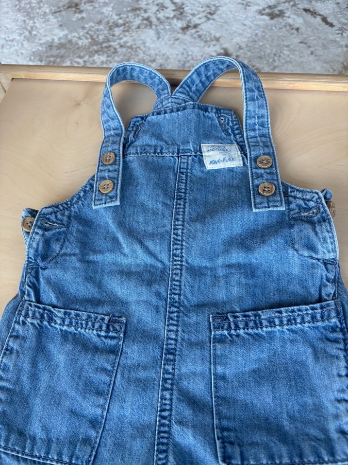 Mavi denim kumaştan, askılı ve kemer tokalı, fitted kesimde kız çocuk tulumu. Önünde iki cep ve ahşap düğmeler bulunur.