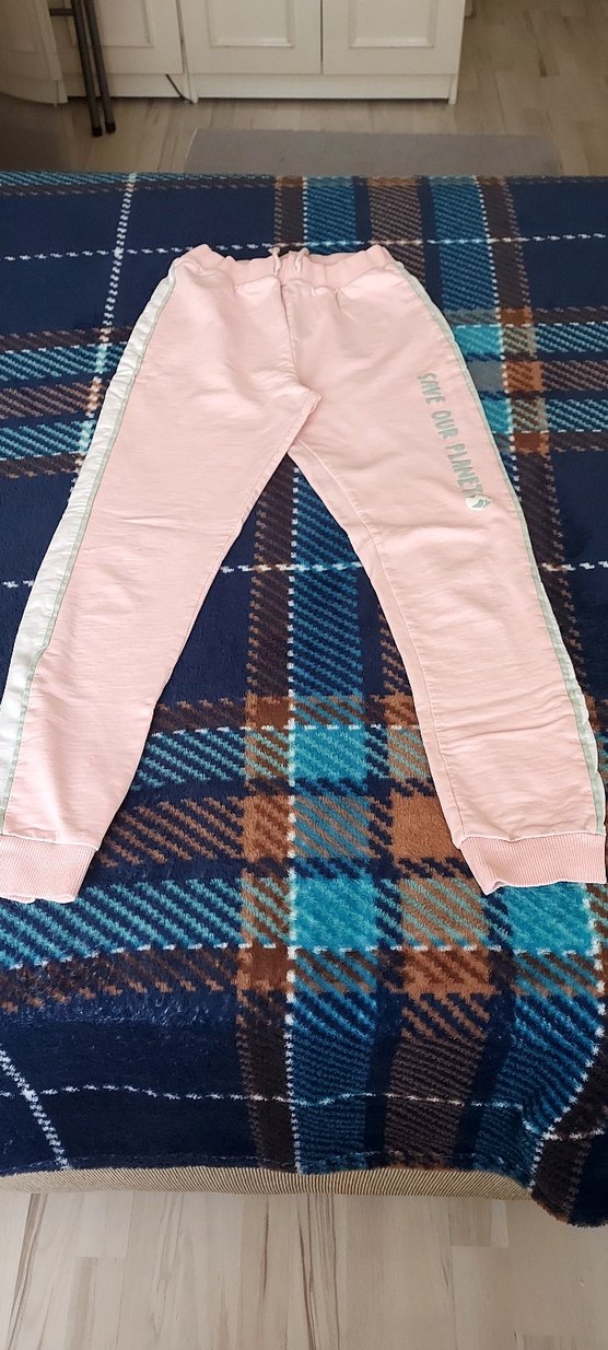 Pastel pembe renkli, yan şeritli ve lastikli bel bandına sahip kız çocuk eşofman altı Yumuşak sentetik kumaştan üretilmiştir. Bel 26 , boy 183 cm .Sağ taraf diz altı yanda bir delik vardır.( son fotoda )