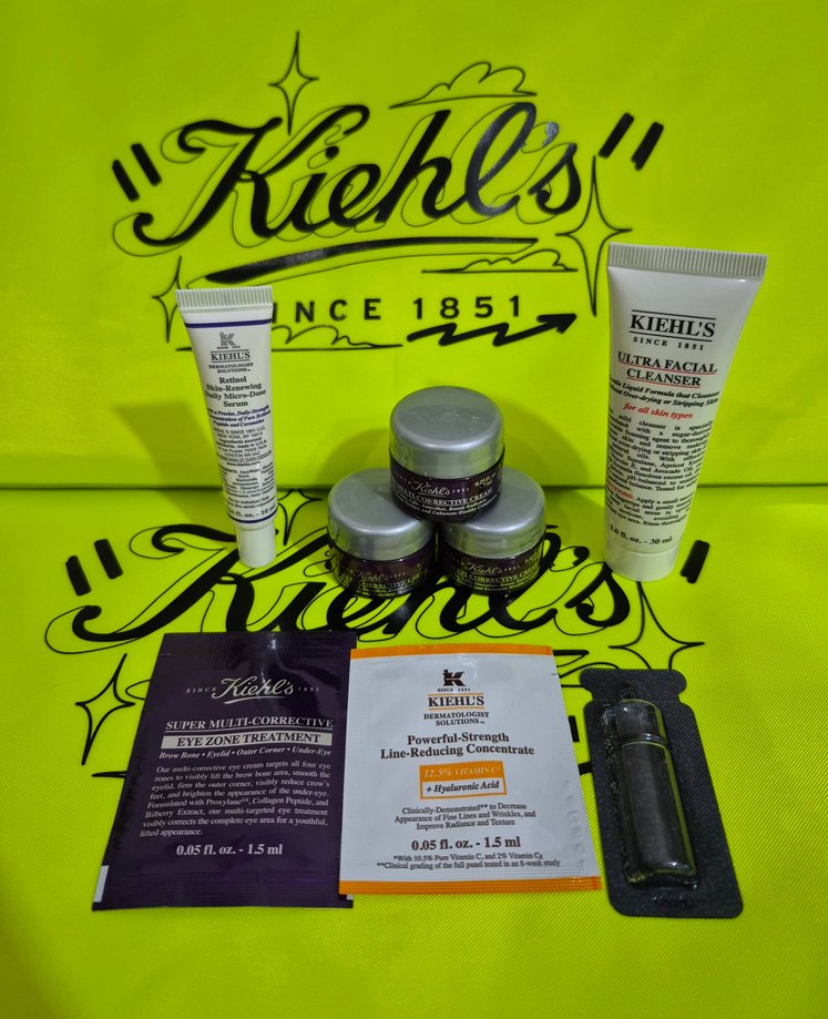 Kiehl's cilt bakım seti, Ultra Facial Cleanser, göz çevresi bakım kremi ve çizgi azaltıcı konsantre içerir.
