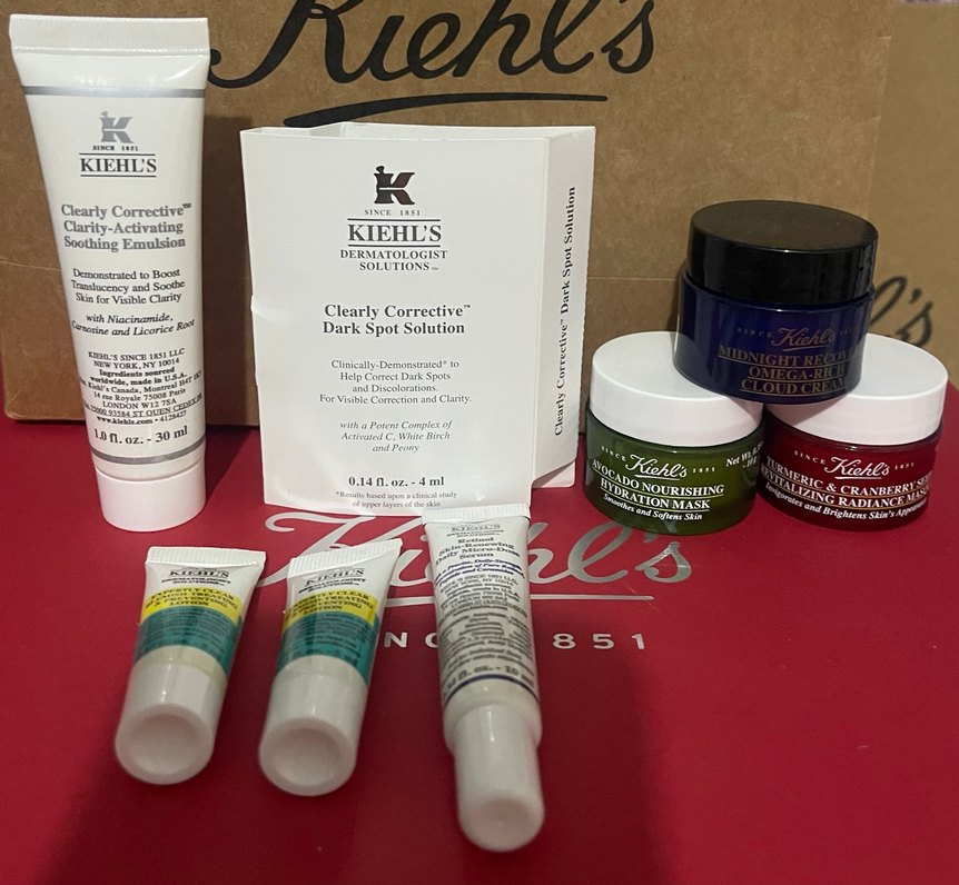 Kiehl's kadın cilt bakım seti, cilt tonunu eşitleyen ve nemlendiren çeşitli ürünler içerir.