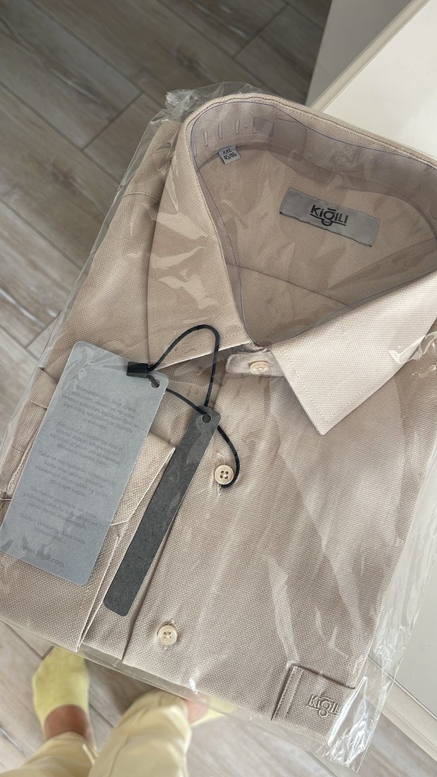 Kigili markanın bej renginde, uzun kollu, düğmeli ve kesik yakalı erkek gömleği. Ofis ve sokak stiline uygun, ipeksi dokuda.
