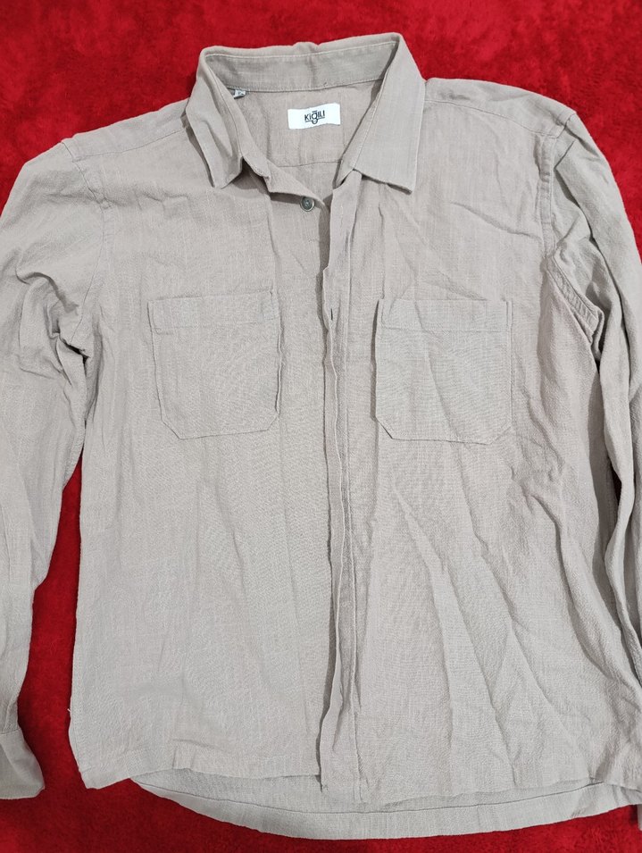 Bej renkli, keten kumaştan yapılmış, rahat kesim uzun kollu erkek gömleği. Düğmeli günlük kullanıma uygun casual tarzda.
