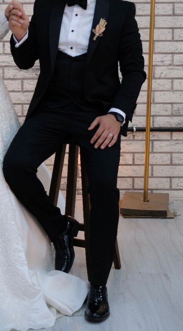 1 kere nikahta giyildi. 1.75 boyla giyildi.Saatlik o kadar yakasındaki saten parça çıkarıldı ama geri takılabiliyor o kadar Papyonu Gömleği Kol düğmesi Ceketi bel kemeri Pntalon kemeri Pantalonu Hepsi verilicektir. İsteyene uyarsa 41 no rugan ayakkabıda verilebilir.
