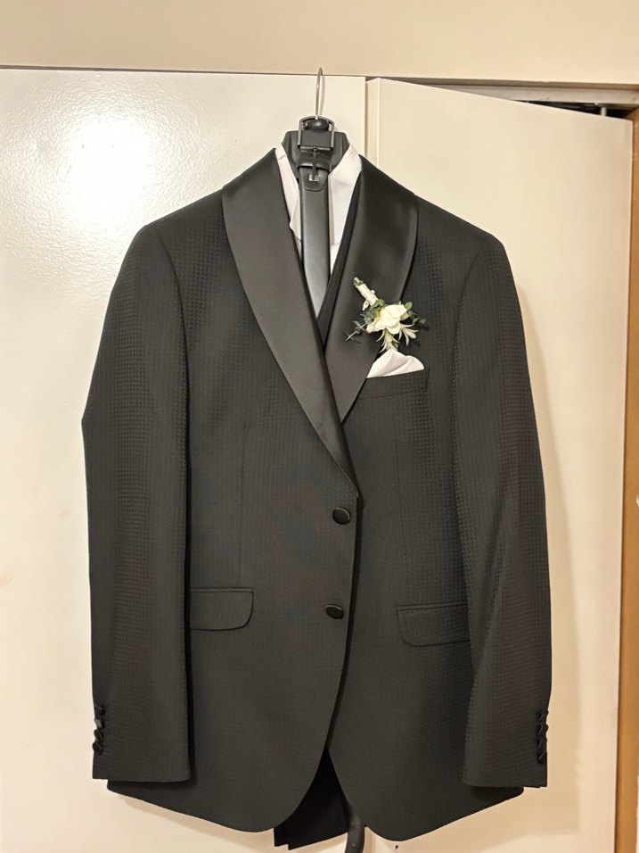 Düğmeli ön kısmı ve kesik yakasıyla modern klasik görünüme sahip erkek takım elbisesi. Siyah renkte, slim fittir. Kuru temizleme yapılıp giyime hazırdır. 1 gün giyildi.
