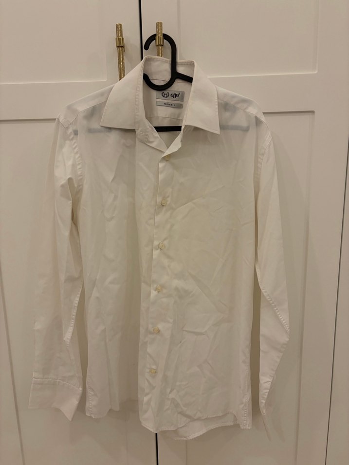 Erkek beyaz, uzun kollu ve düğmeli klasik gömlek. Ofis ve günlük kullanıma uygun, normal kesim. 1-2 kez giyilmiştir yeni ve hiç bir sorunu yoktur.