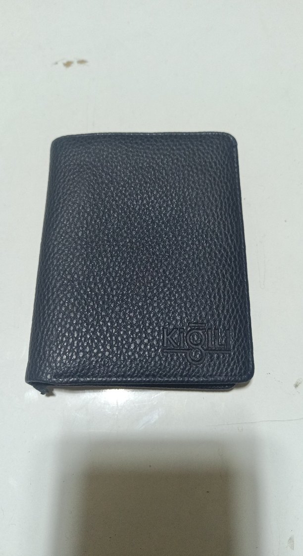 Mavirenkli, dokulu malzemeden yapılmış, baskılı logo detaylı minimalist erkek cüzdanı.