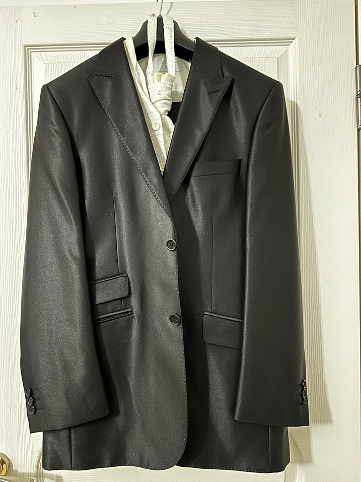 Erkek siyah takım elbise, düğmeli ve kesimli yaka detaylıdır. Parlak kumaş, uzun kollu ve klasik modern tarzda, ofis kullanımı için uygundur. Damatlık