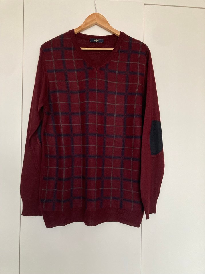 Bordo renkli, uzun kollu, yuvarlak yakalı erkek triko kazak. Yün kumaştan örülmüş, bol kesim ve kareli desene sahip, gündelik rahat stil için uygun.